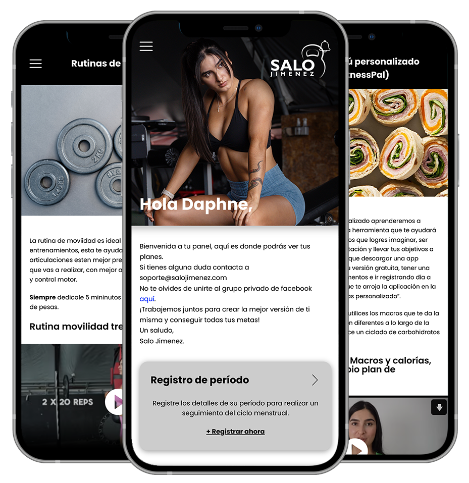 Seguir tu plan y rastrear tu progreso será simple y fácil, encontrarás tus macronutrientes y calorías de acuerdo a tu objetivo, un menú básico de comidas, un recetario, teoría del entrenamiento, teoría de la nutrición, el entrenamiento con los respectivos videos y mucho más… todo eso está en salo jimenez, app exclusiva para miembros.